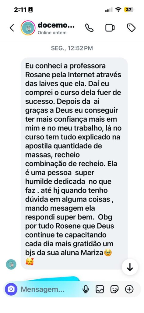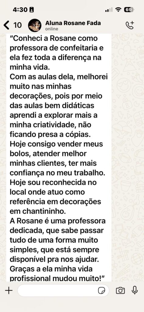 A Rosane já ajudou centenas de alunas iniciantes a mudarem seus resultados na confeitaria, ensinando sempre de forma clara, acolhedora e prática.